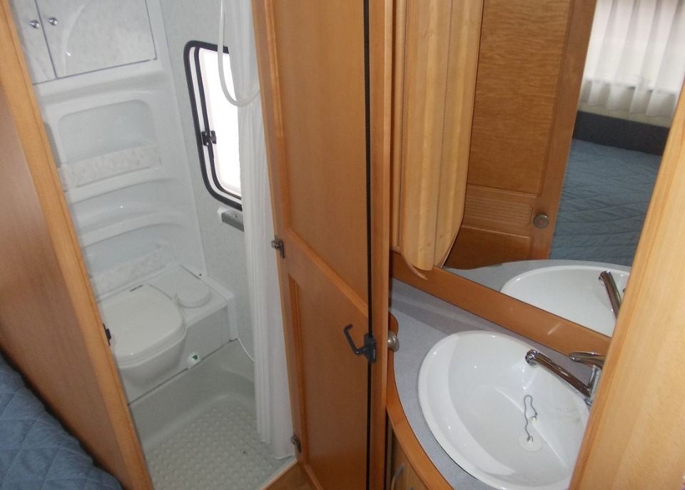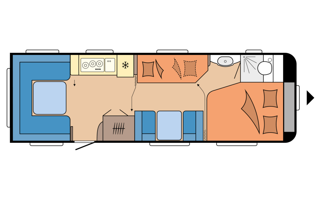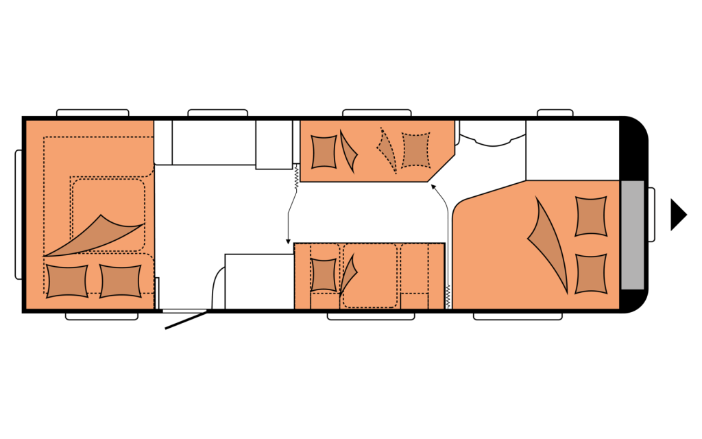- łóżko francuskie king-size z przodu pojazdu – 195 x 157 / 128 cm
